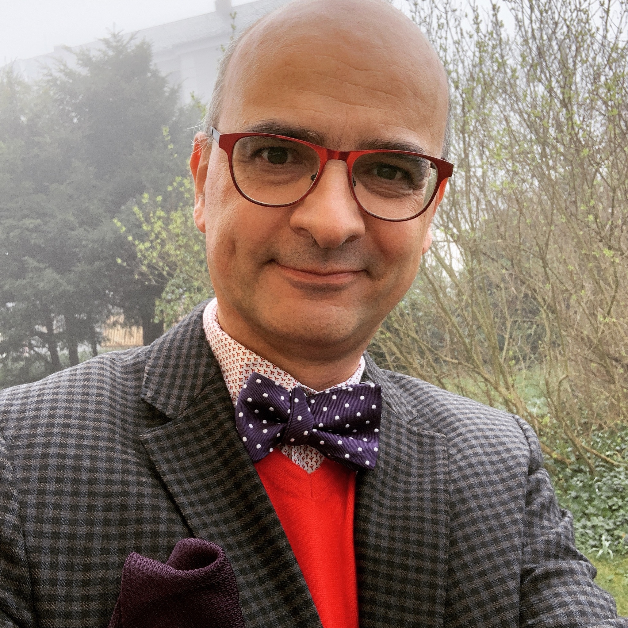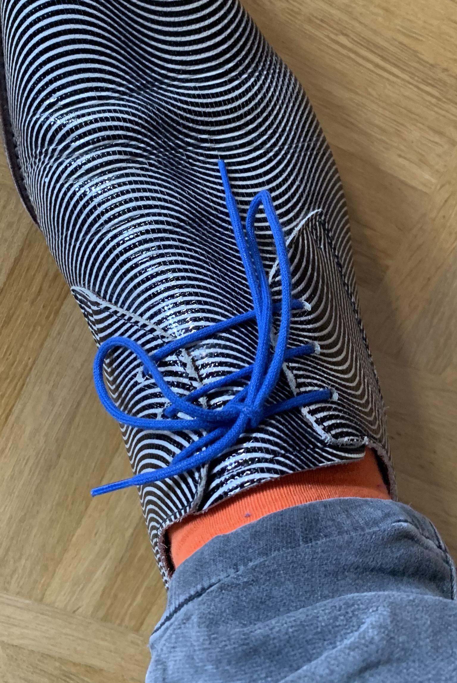 Eine Versicherung rät zu heller, möglichst reflektierender Kleidung. Vielleicht ist das aber nur die halbe Wahrheit. Der Nebel ist nicht nur ein Problem der Augen, sondern auch der Psyche. Bei Nebel muss man die Seele fröhlich stimmen. Die Schnürsenkelkolumne rät daher zu kräftigen Farben im Falle von Nebel. Ich habe es mit einem kräftigen Rot und etwas Violett dazu probiert, siehe oben.