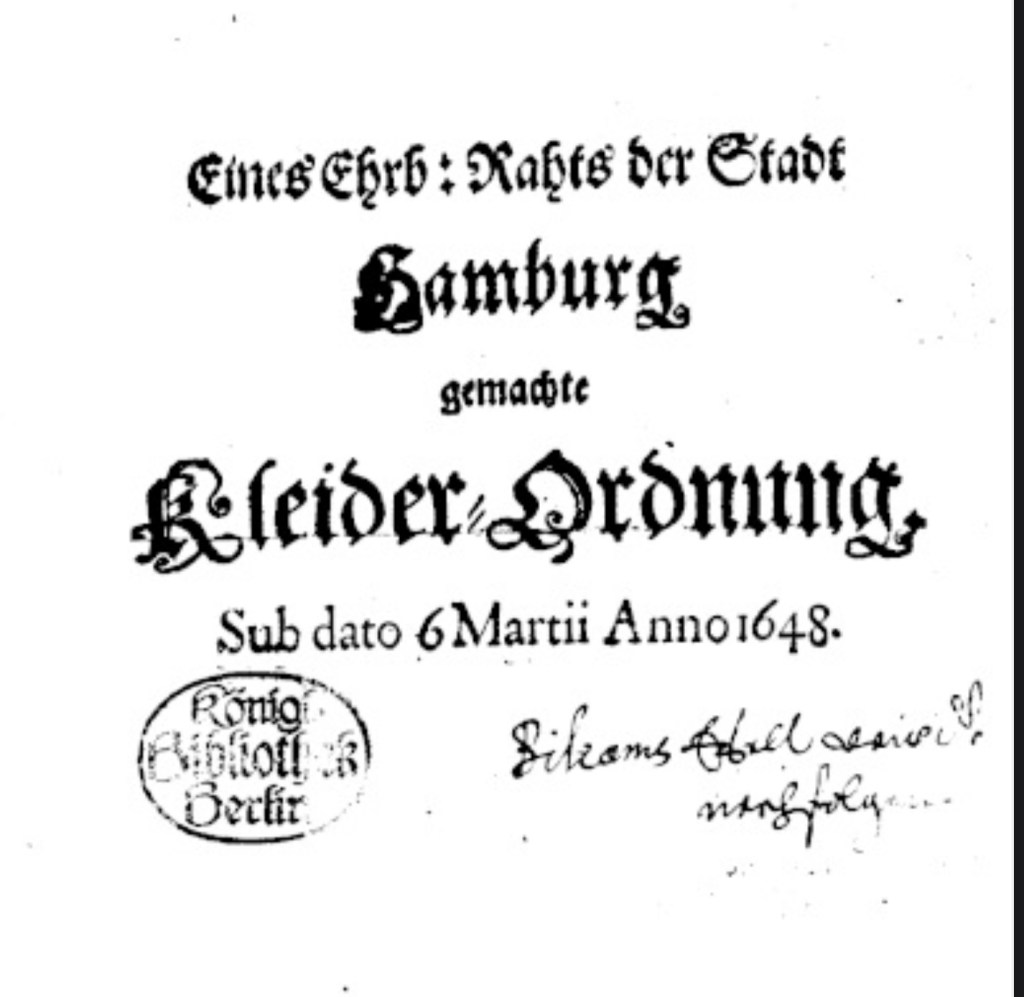 Genau das haben wir ja schon immer gesagt. Selbiges zu betonen liessen die Moralapostel christlicher, gelegentlich auch nicht christlicher Couleur, über Jahrhunderte hin keine Gelegenheit aus. Die üppigen Gewänder stürzen dich ins Verderben, verleiten dich zur Hoffart und ruinieren überdies deinen Geldbeutel. Im März 1648 sah sich daher zum Beispiel der Rat der Stadt Hamburg veranlasst, eine Kleiderordnung zu erlassen. Darin hieß es unter anderem, dass „tägliche Erfahrung und Augenschein leider bezeuget / in welchem Maße in dieser guten Stadt die Hoffart und Üppigkeit / insbesondere in Kleidungen / fast bei jedermann über Standes Gebühr / dermassen gewachsen und überhand genommen / daß sowohl GOttes Zorn über diese Stadt dadurch erwecket / als auch mancher in seinem privaten Bürgerlichen Stande / in mercklichen Abgang / wo nicht gäntzlichen Ruin seiner Nahrung und zeitlichen Wolfart gebracht wird.“ Um die Bürger und, zweifellos noch wichtiger, die öffentliche Ordnung zu schützen, wurden zum Beispiel goldene oder silberne Knöpfe verboten sowie „übermäßige und unförmliche Perlen Schnüre / wie auch die Ohren-Gehänge von Perlen / gäntzlich“ untersagt.
