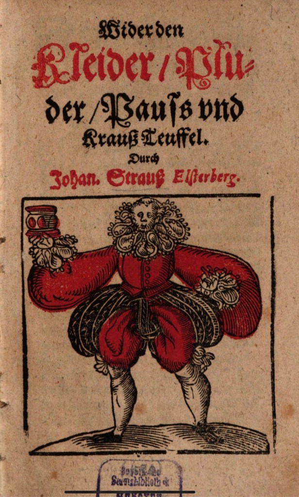 Und so hat die Macht die Mode häufig als Konkurrentin betrachtet. Dabei verbündete sie sich mit der Moral, und die beiden gingen Hand in Hand gegen unschickliche Kleider vor. Freilich machte das die verbotenen Gewänder erst richtig gut. Und dazu trugen wohl auch die Illustratoren ihren Teil bei. Nicht selten wurde nämlich die Kritik der Hoffart, welche sozusagen als die Modesünde schlechthin galt, mit übertriebenen Darstellungen unschicklicher Outfits garniert. Sie sollten offenbar abschreckend wirken, erreichten aber möglicherweise genau das Gegenteil. Und so fand ich zum Beispiel vor einiger Zeit in der St. Wolfgang Kirche zu Schneeberg im Rahmen einer Kreuzigungsdarstellung einige Modesünden dargestellt. Freilich so auffallend, dass man sich des Eindrucks nicht erwehren kann, der Maler hatte durchaus Freude an solch detailgetreuen Abbildungen des Verbotenen. 1581 erschien in Leipzig eine Schrift „Wider den Kleider-Pluder, Pauß- und Kraußteufel“, ein eigenwilliges Pamphlet gegen diverse Üppigkeiten des Modebetriebs, wie etwa Pluderhosen oder Halskrausen. Hinter all der übertriebenen Kleiderpracht müsse man nach Meinung des Verfassers letztlich den Teufel selbst vermuten. Und so schildert er zum Beispiel, wie ein junger, modisch gekleideter Mann mit einer üppigen Halskrause zum Empfang des Heiligen Abendmahls an den Altar kommt. In seinem Kragen sitzt ein kleines Teufelchen, was er selbst gar nicht bemerkt.