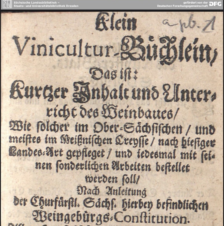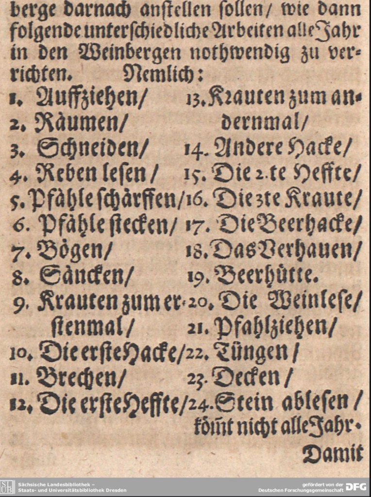 Besagtes Vinicultur-Büchlein war ein Handbuch, welches die kurfürstlich sächsische „Weingebürgsordnung“ von 1588 mit ihren vorgegebenen 24 Arbeitsschritten des Weinbaus praxisorientiert erläuterte.