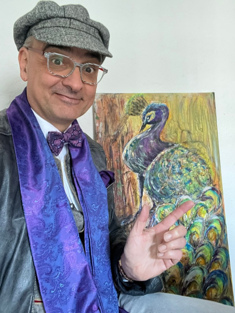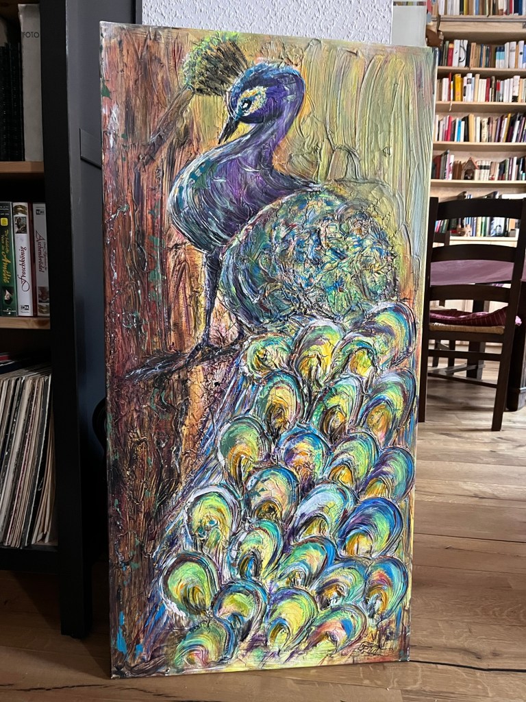 Zu Weihnachten ist er nun also bei mir eingezogen. Der Pfau. Gemalt von Kerstin Lungmuss (rizi_art). Bunt, raffiniert, etwas exzentrisch, wie man ihn eben kennt. Auf Nachfrage hin fiel das Urteil der community recht einhellig aus: 91 % meinten, dass er wohl recht gut zu mir passe, wenn nicht gar mit mir identisch sei.