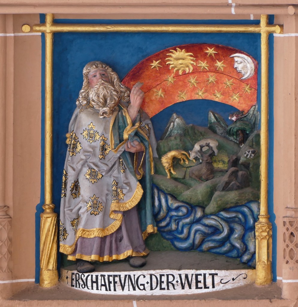 Erwähnen möchte ich, dass es in der St. Annen-Kirche in Annaberg-Buchholz eine Darstellung Gottes gibt, die Gott in schicker Kleidung zeigt: er trägt Schuhe, und zwar solche, die nach dem Zeitgeschmack des 16. Jahrhunderts sehr modern waren. Und er trägt einen festlichen Mantel, auf dem die Sterne des Himmelszelts abgebildet sind.