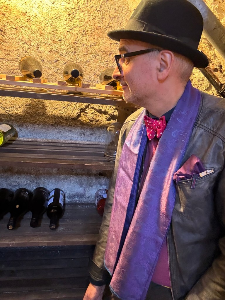 Nach einem ersten Stirnrunzeln hieß ich sie dann auch sehr gern willkommen. Denn ich machte mir schon früher gern einen Spaß daraus, über die passende stoffliche Begleitung für einen Traminer, Grauburgunder oder Portugieser zu fabulieren. Zum Chablis trägt man apricofarbene Socken. Das ist bekannt. Der Tannat gesellt sich recht gern zur Lederjacke. Die Jeans lässt sich