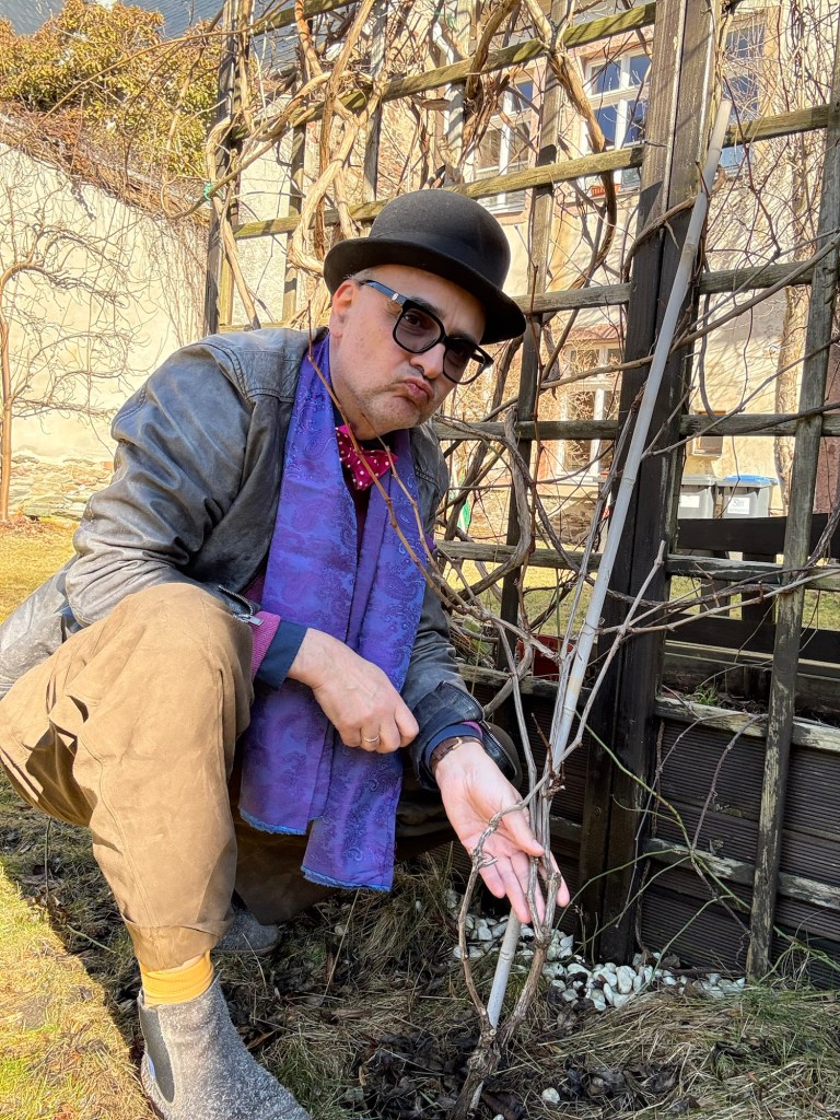 Mitarbeiter im Weinbau. Auch ich – genau genommen war es mein lieber Schatz, denn mein persönliches Weinbau-Diplom wurde noch nicht freigegeben – habe die Annaberger Rebe in die mineralische Erde des Gebirges eingebracht. Frostbeständig. Solider Schick.