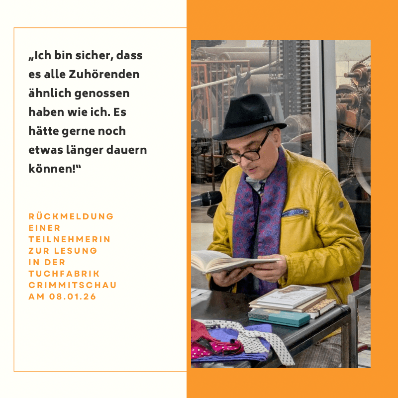 - 08.01.2026 17:00 Uhr Tuchfabrik Gebr. Pfau, Leipziger Straße 125, 08451 Crimmitschau – Lesung „Der begehbare Kleiderschrank“