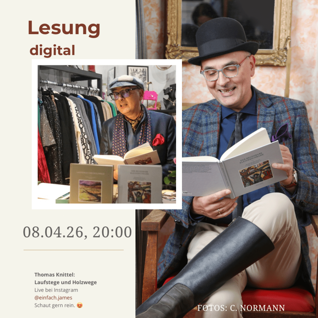 - 01.10.2025 19:00 Uhr Modeschlösschen, Schloßallee 5B, 01468 Moritzburg – Lesung „Der begehbare Kleiderschrank“ mit Modenschau